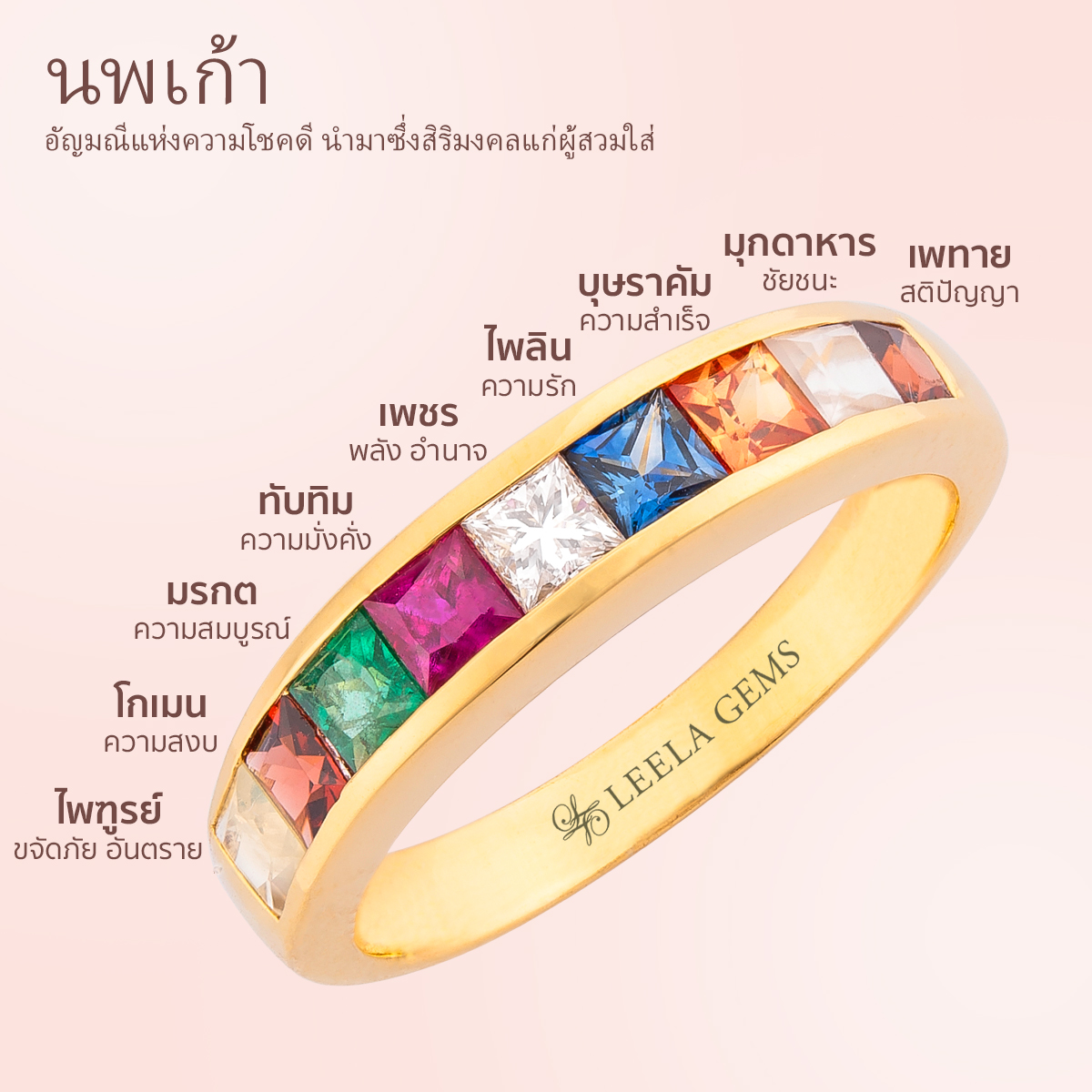 ความเชื่อเกี่ยวกับแหวนนพเก้า ซึ่งเป็นเครื่องประดับที่มีประวัติศาสตร์อันยาวนานหลายร้อยปี ประกอบด้วยอัญมณีมงคลถึง 9 ชนิด ได้แก่ เพชร, ทับทิม, มรกต, บุษราคัม, ไพลิน (นิลกาฬ), โกเมน, มุกดาหาร, เพทาย และไพฑูรย์ (ตาแมว) พลังเหล่านี้ถูกเชื่อว่าจะนำสิริมงคลมาสู่ผู้สวมใส่ เป็นการผสานพลังอันยิ่งใหญ่ของจักรวาลเข้ากับชีวิตประจำวัน